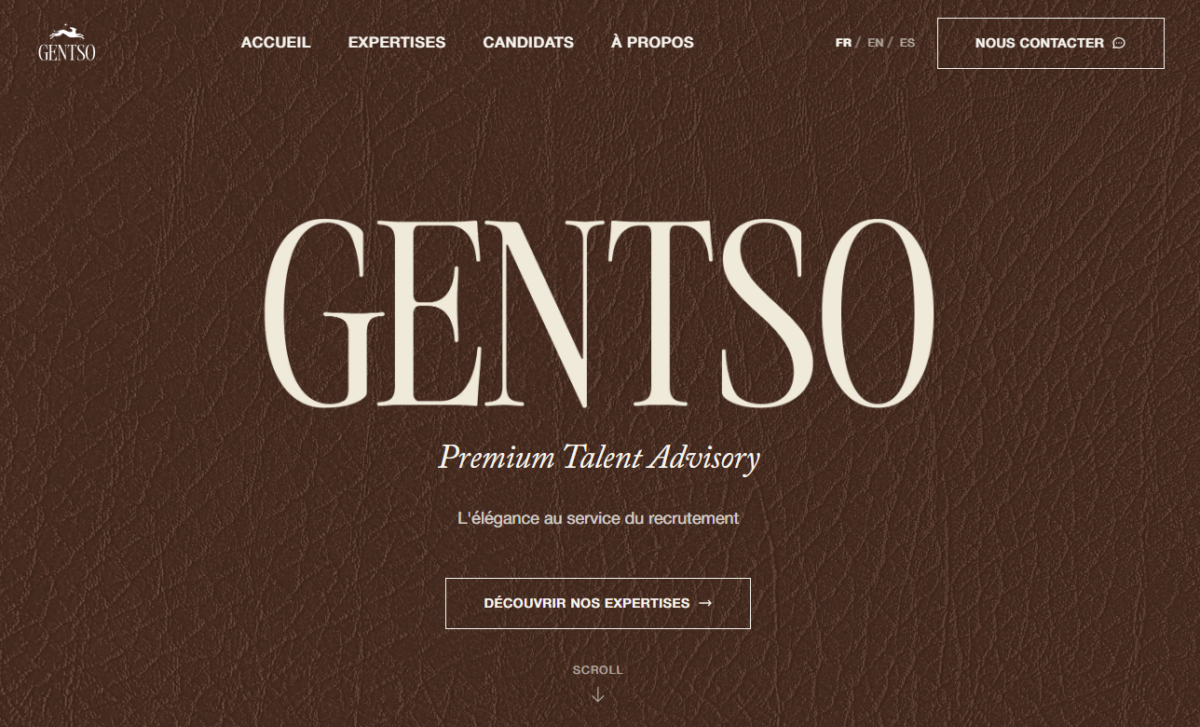 Site vitrine premium pour un cabinet de recrutement international spécialisé dans l'IT et le luxe. Design sur mesure, performances optimales. Thème WordPress développé de zéro à partir de maquettes Figma.