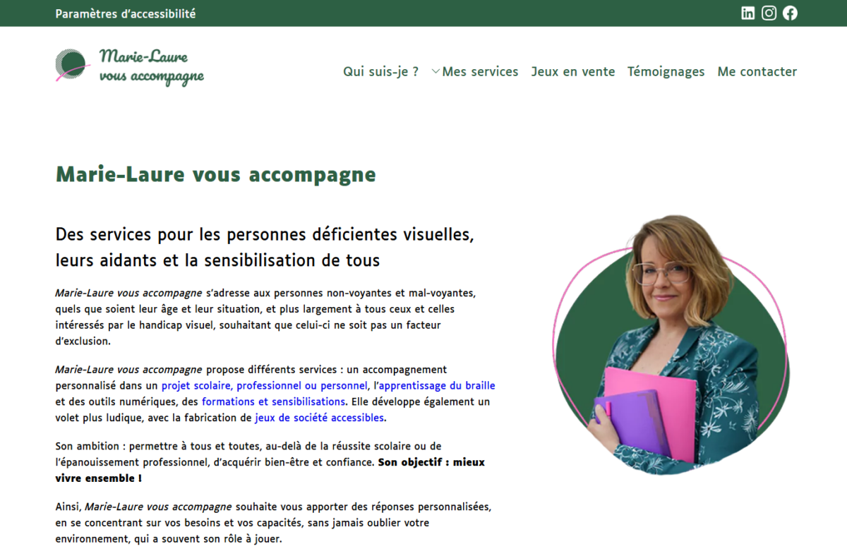 Site vitrine accessible pour une accompagnatrice spécialisée dans le handicap visuel. Services d'accompagnement, boutique de jeux de société accessibles, vidéos de sensibilisation. Projet accessibilité first — thème WordPress développé de zéro à partir de maquettes Figma, avec une approche où chaque composant a été pensé pour les technologies d'assistance avant le design visuel.